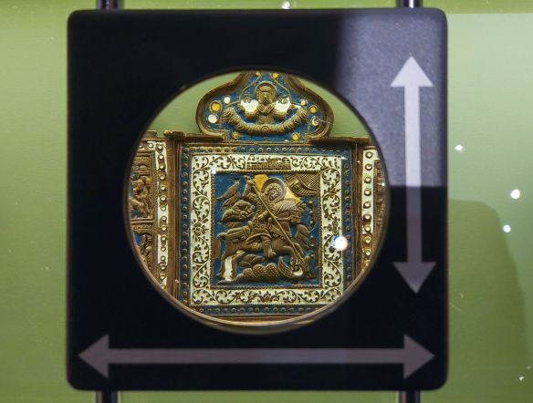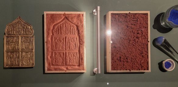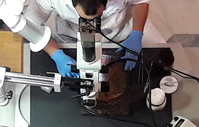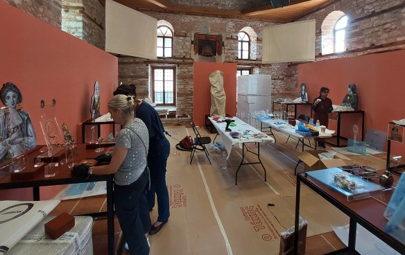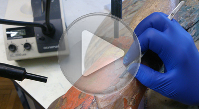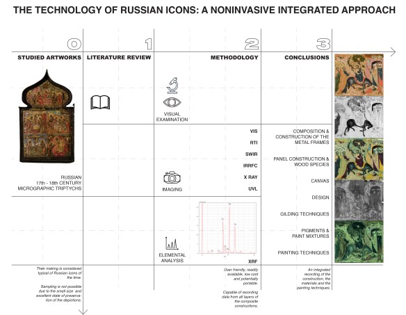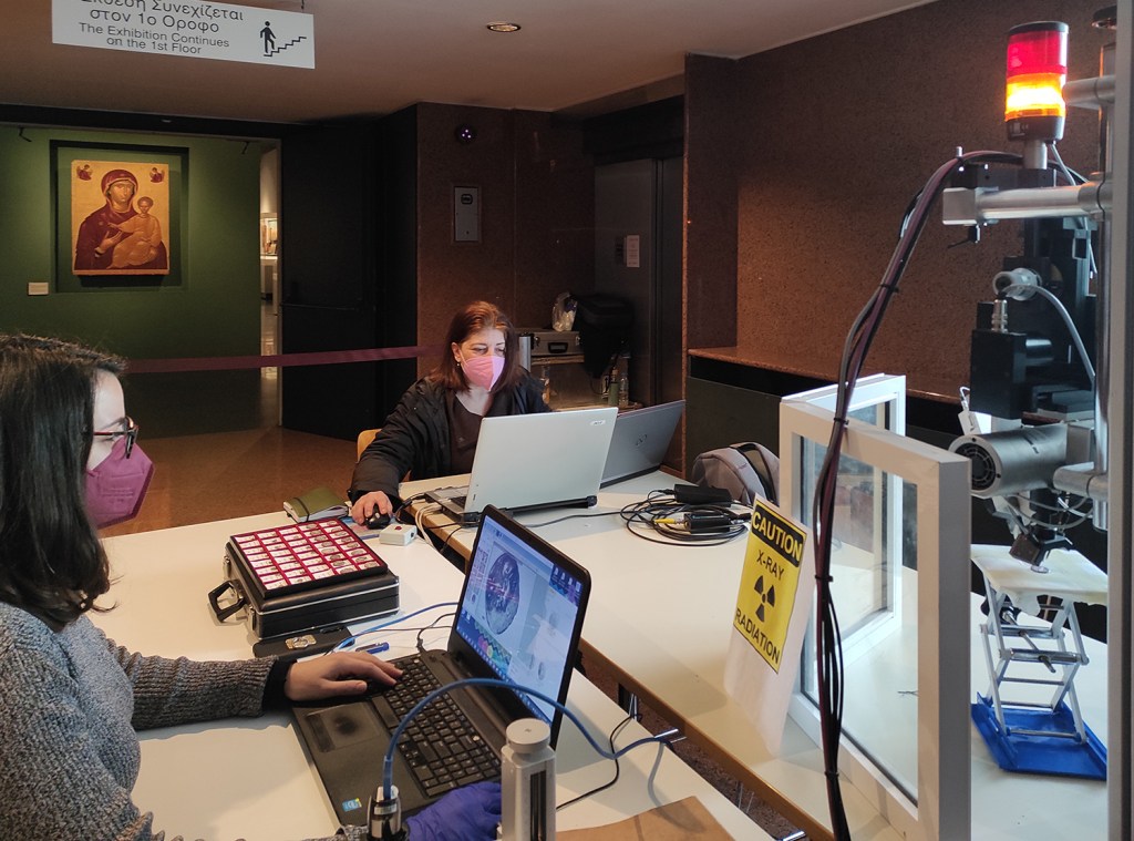 This privately owned, richly ornamented icon of unknown provenance was brought to the Benaki Conservation Laboratory in 2015, in need of urgent care. The treatment took place in two successive phases, the first focused on documentation, consolidation and structural issues and the second on cleaning and restoration. The consolidation of loose and unstable parts of the relief decoration, the paint layers and the fragmented and severely weakened by insect infestation wooden support was the first priority. The board fragments were then joined and held securely in place on a specially designed, inert mount. The cleaning of the three, successive layers of darkened varnish coatings, the restoration and further documentation relating to materials and technique, followed in 2017. Despite the fact that the original vertical pilasters or colonnettes are lost, the tabernacle frame, with its gilded, floral, pastiglia (raised patterns made of coarse and thin gesso layers) and punched decoration, seem Venetian in origin, in a taste typical for private devotional images made in Italy in the early 16th c. In contrast, the figure of St Nicholas is certainly the work of an artist familiar with the Byzantine imagery. As revealed by X-ray images, the central tondo bore no traces of an original painting. The frame might have been left aside in the workshop, sold or transported far away from Veneto and, possibly decades later, commissioned to an artist who produced a work in the greek style of the late 16th c. The icon of St Nicholas, with the saint’s name written in greek and the Italian frame, now in second use, is certainly a work of a highly decorative effect. In terms of style and iconography, St. Nicholas is fully coherent with works of mass production, prepared in workshops of greek masters, active in the Mediterranean during the late 16th and early 17th c. who were capable of producing works of alla greca e latina styles, appropriate for their multiethnic clientele. However and despite all the technical data gathered during documentation, tracing the icons’ true history and “adventures” still remains speculative. In December 2017 the icon, progressing through the 5th c. of its lifetime, restored and in a stable condition, was transported back to Italy – its place of origin, in a never ending adventure.