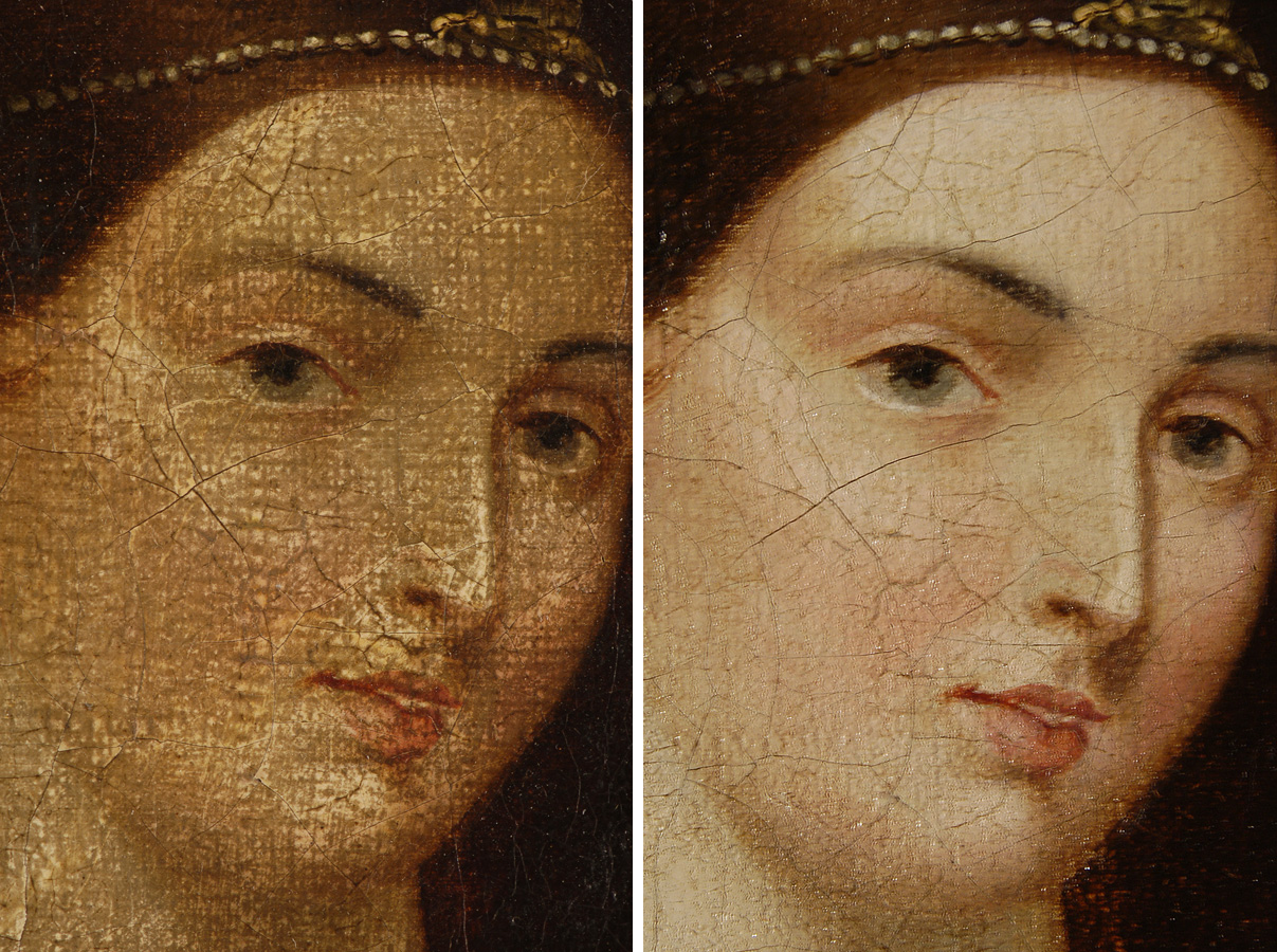 Το βερνίκι που κάλυπτε την ζωγραφική επιφάνεια αφαιρέθηκε με χημικό και μηχανικό τρόπο. Κατά το καθαρισμό αφαιρέθηκαν οι χρωματικές επιζωγραφίσεις και αναδείχτηκε η αρχική ζωγραφική επιφάνεια. Οι περιοχές του καμβά, που παρουσίαζαν φθορές όπως σχισίματα, αποκαταστάθηκαν τοπικά με υαλοΐνες και ακρυλικό γαλάκτωμα. Κατόπιν το έργο ενισχύθηκε με νέο λεπτό λινό ύφασμα πυκνής πλέξης και συνθετική κόλλα. Τέλος αποκαταστάθηκαν χρωματικά οι φθορές της ζωγραφικής και το έργο βερνικώθηκε με συνθετική ρητίνη.