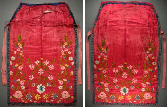 This beautiful, decorated with floral motifs silk apron, had suffered heavily due to inappropriate storage. The silk threads had lost their strength and signs of wear were obvious in many areas. Rough folding had also lead to the formation of numerous creases. An old intervention was recorded along the top edge; where the straps were sewn onto the apron and it is presumed that this was done at some point, in order to modify the size of the garment. Accumulated dirt was removed from both sides of the apron using a vacuum of adjustable suction force, mounted with suitable nozzles. The straps were then removed, washed and flattened separately.  Worn areas and creases were flattened by means of an Ultrasonic Humidifier providing controlled steam. Access to the reverse side of the silk fabric was considered necessary  in order to sufficiently support the worn areas and for this to be achieved, the upper edge of the apron was partially unstitched. Appropriately prepared silk pieces of fabric were used as support. They were inserted between the front, silk part of the apron and the cotton lining, and sewn onto the back of the front piece using silk, single thread, yarns which had first been colored to match the fabric, using Ciba – Geigy textile dyes. Finally the opening along the top part of the apron was closed and the straps were stitched back into place.
